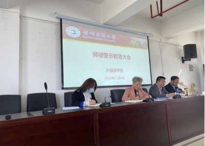 根据校人事处(教师工作部)2022年10月31日下发的《关于开展师德警示教育的通知》精神,我院党政领导班子高度重视,及时部署,于2022年11月4日下午,在贵州民族大学花溪校区15栋1109会议室召开师德警示教育大会。会议由学院党委书记卢文芸主持,全院教职工参加。