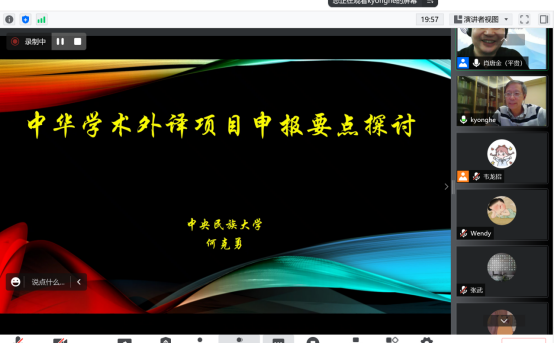 2022年6月18日晚,中央民族大学何克勇教授应邀做客米兰网_米兰(中国)“新知讲坛”,通过腾讯会议线上平台进行了题为“中华学术外译项目申报要点探讨”的报告。本次讲座由米兰网_米兰(中国)院长肖唐金教授主持,来自校内外的数十名师生参加了本次讲座。