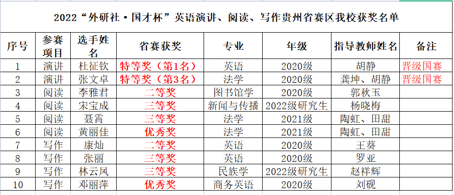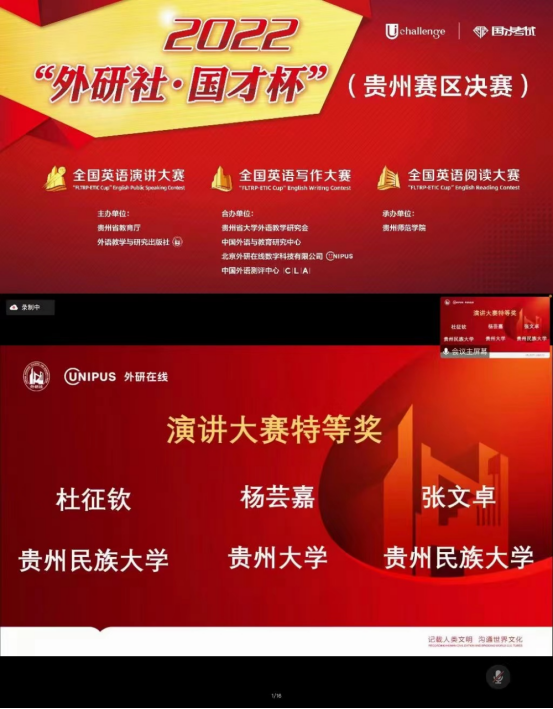 “外研社·国才杯”英语演讲、写作、阅读比赛是外语类被列入中国高等教育学会高校竞赛排行榜首位的大赛。贵州省赛区决赛于2022年11月5日在贵州师范学院举行,贵州民族大学选手在米兰网_米兰(中国)教师的指导下表现不俗,取得成绩如下: