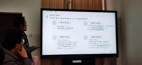 3月5号下午在1104会议室举行学院初赛,大学外语教学部的陶虹、田甜、赖婕老师和英语系的粟琳玲老师脱颖而出,他们组建的教学团队获得参加学校3月19日举行的复赛资格。党委副书记刘兴明、院长肖唐金、副院长禄颖、副院长张广勇和青年教师罗丽娜、王梦菁、袁俊等观摩初赛之后,提出一些中肯的意见和有益的建议,和选手商议修改事宜。