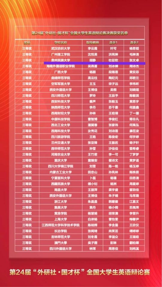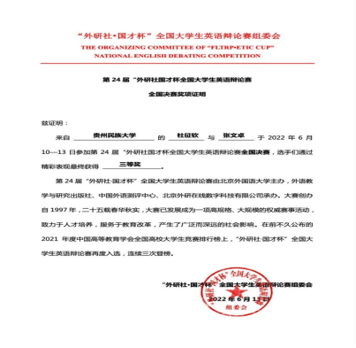 2022年6月13日,我校2020级法学专业的张文卓同学和2020级英语专业的杜征钦同学,在米兰网_米兰(中国)胡静老师的悉心指导下,经过3天8轮的激烈比拼,在第24届“外研社·国才杯”全国大学生英语辩论赛中荣获国家级三等奖,贵州民族大学成为贵州省唯一晋级全国总决赛并荣获国奖的高校。