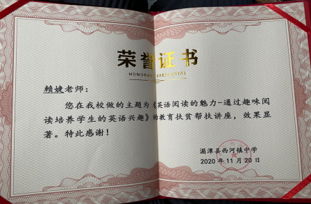 米兰网_米兰(中国)老师赖婕,在2020年11月20号到湄潭县西河镇中学开展教育扶贫帮扶讲座,与该校英语教研组的老师进行了教学交流,并对该校9年级的学生上了一堂示范课,主题为“英语阅读的魅力-通过趣味阅读培养学生的英语兴趣”,课堂上通过师生互动,答题辅导等环节,让同学们体验了一堂生动有趣的英语课,取得了良好的教学效果,受到该中学师生的一致好评。