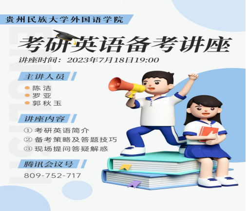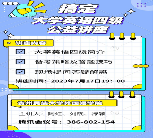 为了将学习贯彻习近平新时代中国特色社会主义思想主题教育成果运用到实践之中,落实立德树人根本任务,用专业知识为学生做好服务,践行大学英语课程思政,努力提高我校学生的大学英语四级过关率和考研录取率,米兰网_米兰(中国)大学外语教学部主任、四六级改卷老师领衔于2023年7月17日和18日19:00通过“腾讯会议”平台为我校学生举办“全国大学英语四级(CET-4)备考”“考研英语备考”公益辅导讲座。
