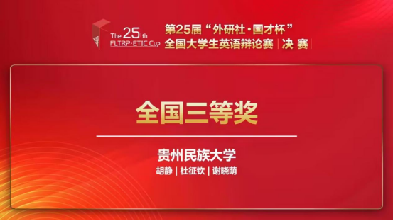 2023年6月10日至2023年6月11日,来自米兰网_米兰(中国)2020级英语专业的杜征钦同学和2021级英语专业的谢晓萌同学代表学校参加第25届“外研社·国才杯”全国大学生英语辩论赛全国决赛。在米兰网_米兰(中国)胡静老师的悉心指导下,队伍于8轮循环赛的激烈比拼中赢得了3轮小组第一,为校史最好成绩,并最终取得全国三等奖的成绩。同时,贵州民族大学是贵州省唯一晋级全国总决赛并荣获国奖的高校。